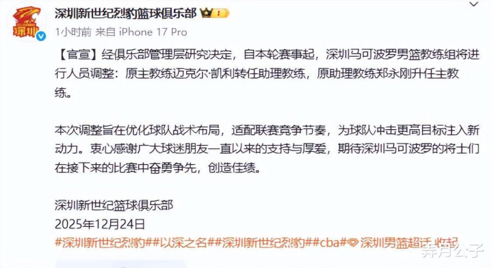 CBA新赛季仅打五轮,第一个下课的主教练就出现了。没错,他就是深圳队的洋帅迈克尔-凯利,已降为助理教练。24日上午深圳新世纪篮球俱乐部宣布,经俱乐部管理层研究决定,自本轮赛事起,深圳马可波罗男篮教练组将进行人员调整:原主教练迈克尔-凯利转任助理教练,原助理教练郑永刚升任主教练。