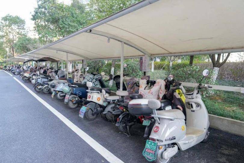 香榭水都小区安装的非机动车停车棚和充电桩。